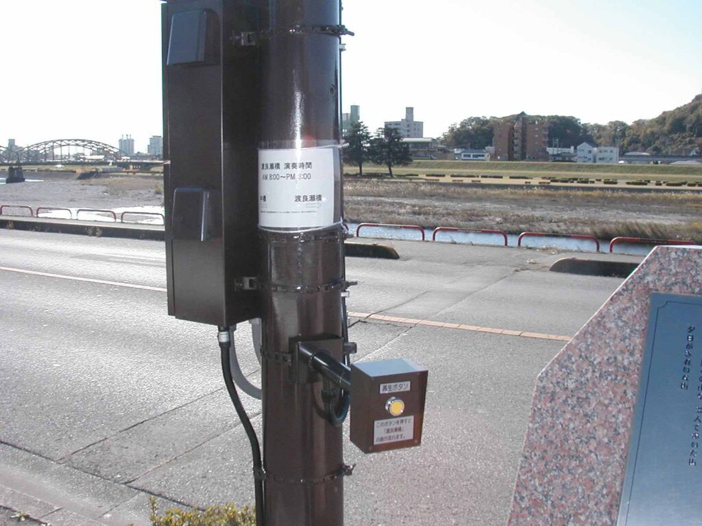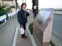 いよいよ歌碑に到着!前方に通行人1名を認識。我先にセンサーに感知されたい某氏が走って追い抜いていきました。そして、彼が歌碑の前に立つと「渡良瀬橋」のイントロが流れ始めました。だはは、なんともうれしそうな顔じゃあありませんか!まさにファンならではの笑顔ですなあ。