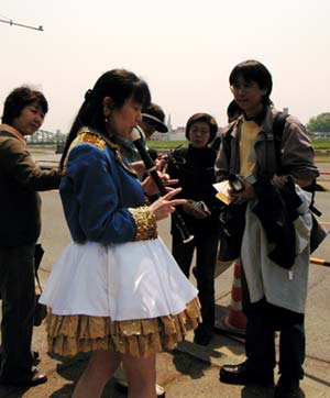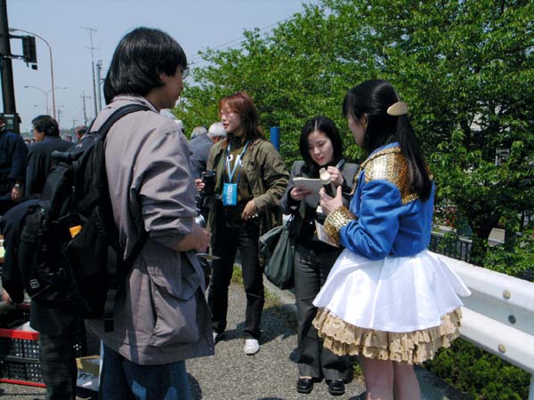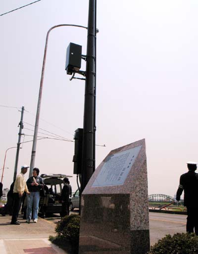 式典終了後は森高さんのコピー衣装を身にまとった森高ファンの元に取材が殺到。TVやら新聞やらの取材を受けていました。曲は歌碑そのものからではなく、併設された柱の上に取り付けられたボックスに付いているスピーカーから流れます。またその下部に赤外線と思われるセンサーがあり、歌碑前に人が立つと1秒ほどで曲が流れ始めます。歌碑前のブロックを恐る恐る足で踏むようにしている人もいましたが、それは間違い。ブロックにスイッチはありません。(^_^;