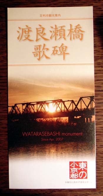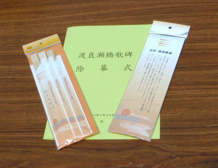 除幕式の式次第と割り箸「わたらせばし」(爆)を撮らせていただきました。来賓の方々に配布された物です。この箸は観光協会で100円で販売するそうです。裏には渡良瀬橋が森高さんによって歌われたとの説明書きがあります。お土産にどうぞ!