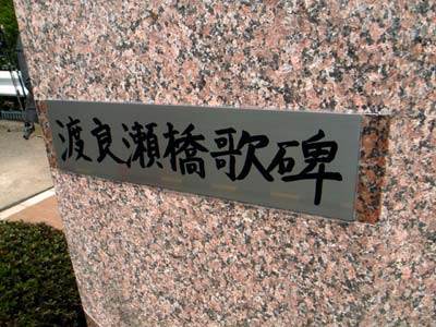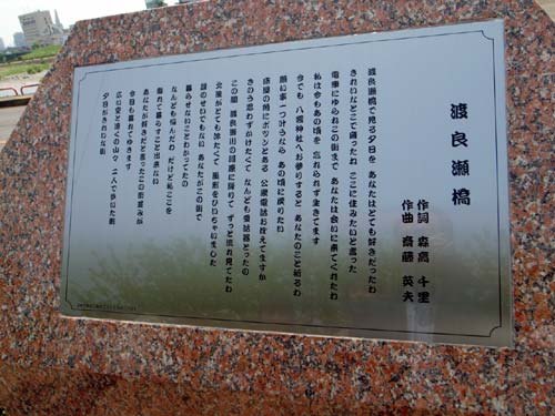 歌碑の車道側の「渡良瀬橋歌碑」の題字は市長によるものです。車道を走る車からはこの歌碑名が見えます。いきなりキキーッ!という急ブレーキの音!!前の車に衝突寸前。ほんの20cm程でギリギリ止まりました。歌碑を眺めながらのよそみ運転。信号待ちの車にあやうく追突するところでした。もしも車で通過する際はくれぐれも前方にご注意下さい。