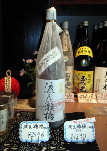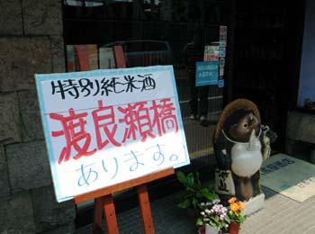 一通り撮影大会を繰り広げ、歌碑のある歩道の脇にある「通三丁目児童公園」前にある酒屋「大黒屋」さんへ。「特別純米酒 渡良瀬橋あります。」の看板が気になっていたのです。店内に入ると「渡良瀬橋」の一升瓶が置かれていました。