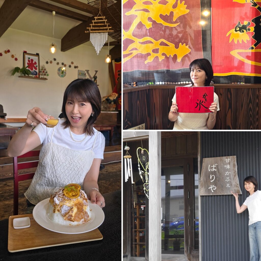 「お腹が空いたので、ちょっと暑かったからかき氷を食べに行きました。」お腹が空いてかき氷?って思いました。 「かふぇばりや知ってますか?色々食べて来ました。スタッフと4人で行ったので4種類食べられるんですよ。ちょっとずつ食べました。スイカ、マンゴー、レモンパイ、チョコミント。美味しかったです。クオリティーが高くて東京でも人気になるんじゃないかなと思いました。行かれた方美味しいですよねえ。声出してくださ~い。行った人いますか?先週行ったの?何食べたの?」チョコミントー! 「一緒ですね。」と地元の方々とコミュニケーションしたい森高さん。こういうやりとりをどんどん地元の方々に楽しんで欲しいですよね。「おかかとか、とうもろこしとか、おかずっぽいのもありました。海苔が全体的に乗ってるのもありました。」