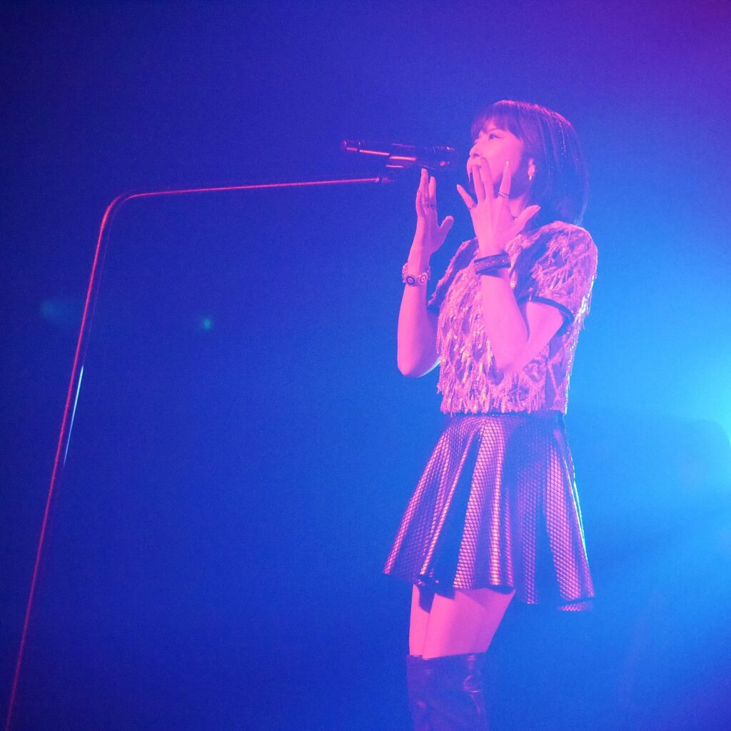 歌い終わって汗を拭きまくり。結構長い時間拭いていました。「もうすでに暑いですぅ。大丈夫ですか、みなさん?コンサート会場の中はどうしても暑くなっちゃうので、水分補給しながら見てくださいね。ちゃんと飲み物持ってますか?」はーい!「大丈夫?」大丈夫!「皆さんもだいぶ汗拭いてますね。」ガチ勢の皆さん、すでに全開で踊ったりしてましたからね。「気持ち悪くなったりしたら私に言ってくださいね。」あはは! このパターンは初めてじゃない? 「挙手しなくてもいいですからね。」笑 「7月に入ってから暑いというのはありますけど、今年は梅雨が短くて雨もあまり降らなくて。こんなに暑くなると思ってなかったので、暑い衣装になってしまいました。背中が凄いことになってます。7月は好きな季節で気持ちいいというか。7月がお誕生日の方、手を挙げていただいてもいいですか?」たくさんの方が挙手。「ありがとうございまーす!ありがとうございまーす!」ってなんで手を挙げたのを見て、ありがとうござますって言ってるんでしょ。おめでとうございまーす!じゃないの?と思いながら7月生まれの自分も手を挙げていました。数が多いのでこちらには視線は来ません…。残念。「今日がなんとお誕生日という方いらっしゃいますか?」おめでとー! 「3,4,5…。あれだんだん増えていった。5,6人いらっしゃいました。おめでとうございまーす!」