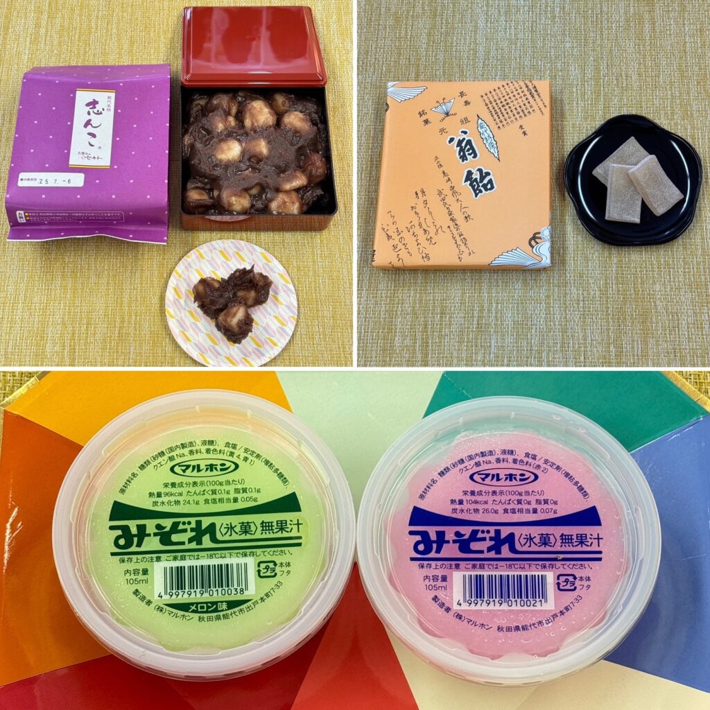 「レストランジロー知ってる?のしろ牛弁当をテイクアウトしました。能代牛は初めてだったんですが柔らかくて美味しいですね。普通のと上があったんですけど、上をいただきました。美味しくてびっくりしました。納豆も有名なんですよね。檜山納豆。ララサンシャインレディオというラジオ番組で紹介して、まだ食べてないんです。檜山茶もあるんですよね。あまり飲んでない?桔梗屋の翁飴。素朴で懐かしい味で、昔食べたことがあるようなないような…。」笑 「お菓子のセキト。え?買って来たんですか?」買ってきた! 「凄いですね!こしあんも餅も美味しかったです。みなさんよく食べてるんですね。持って帰ると固くなっちゃうかな。」当日だけー! 「夏の定番のアイスというみぞれ。これって東京にも売ってるよね。あれ?違うかな。私はコンサートでいろんな所に行ってるので、インスタで紹介できればなと思って。私の写真を見て能代市に来る方もいると思うので、その時は優しくしてあげてください。」