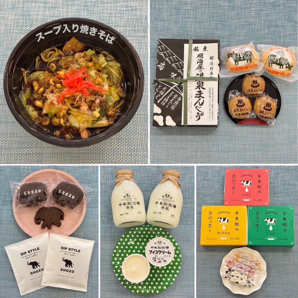 千本松牧場、スープ入り焼きそば、御菓子司処明治屋の温泉まんじゅう、那須野牧歌、SHOZOのZOクッキー・ドリップバッグ、千本松牧場の牛乳・アイスクリーム・千本松のホロッホー、GOODNEWSのバターのいとこ・バターサンド・わたおとめ、関東栃木レモン飴・関東栃イチゴ飴