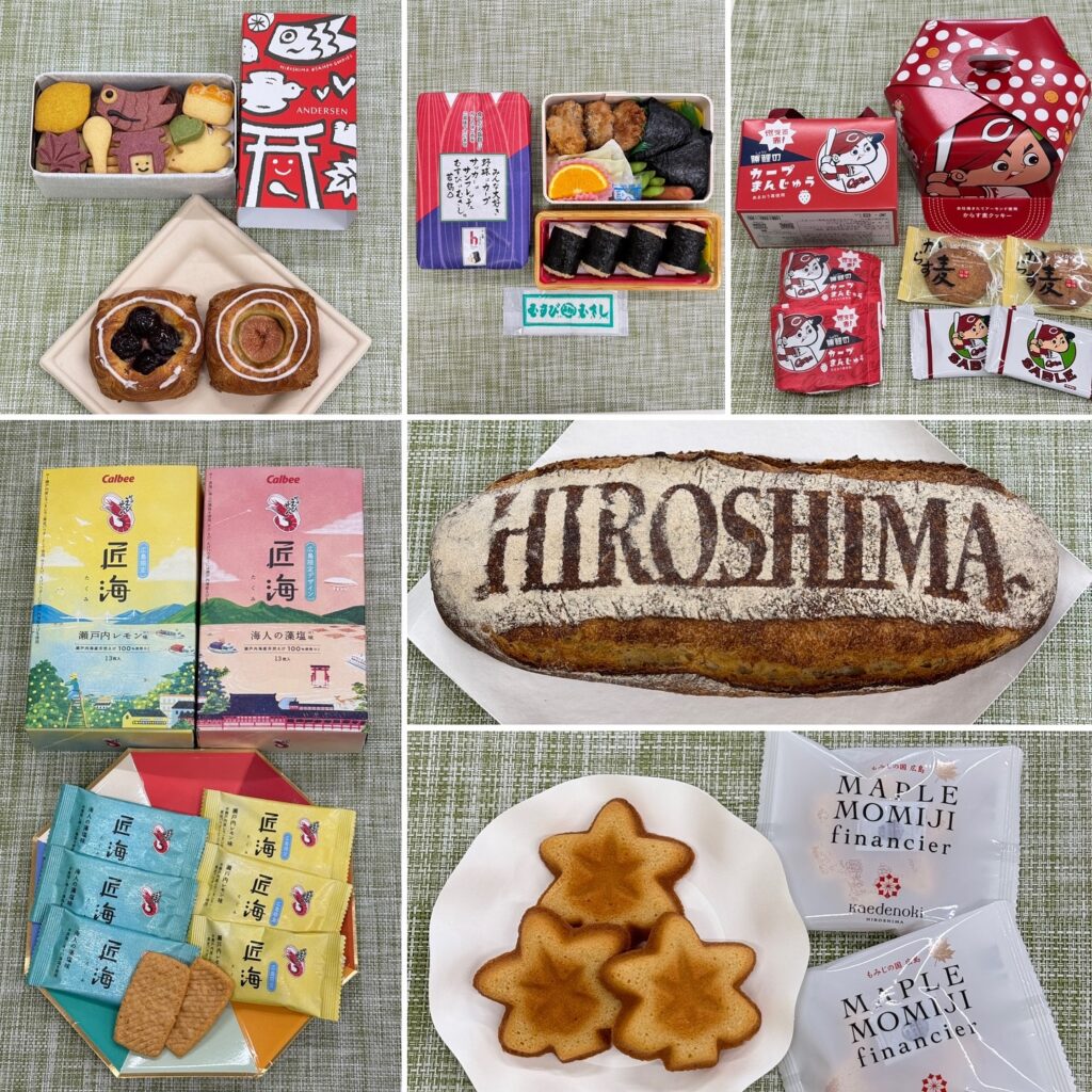 むすびのむさしの若鶏むすび、俵むすび、アンデルセンのダークチェリー・いちじくのペストリー・ひろしまサワーブレッド・広島おさんぽクッキー、楓乃樹のメープルもみじフィナンシェ、Calbeeカルビーのかっぱえびせん匠海
