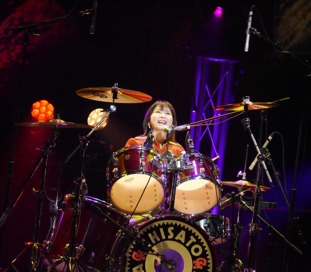 「私も50歳を超えて、今何歳なのかよくわからなくなって来てます。ゴォーゴォーツアーの時は55って区切りがいいのでわかってたけど。今は私55だっけ?56だっけ?って。お誕生日といっても嬉しいような嬉しくないような。でも友達とか知り合いとかファンの方に言ってもらえるとうれしいですよね。8月、今日、9月のお誕生日のために張り切って歌いたいと思います。えー、これはマイドラムです!ドラムを叩きながら頑張って歌いたいと思いますよ。」